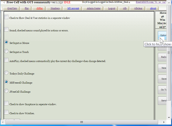 Click to hide show options page that contains Check Boxes and Radio Button that, when selected, modify the behavior of JSFreecell.